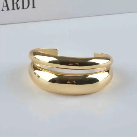 This sleek double-layer bracelet features a bold, wide design with a polished finish. Crafted from real gold-plated alloy, it adds a refined touch to any outfit. Available in silver and gold, its 3.2cm width and 6cm inner diameter offer a comfortable fit for everyday elegance or evening style.