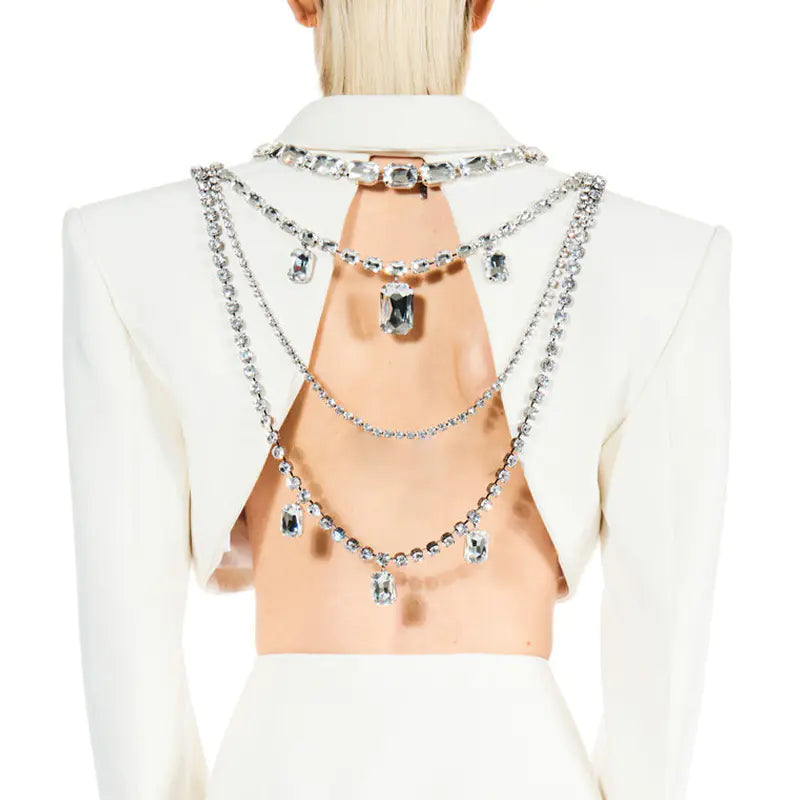 Elevate your style with our exquisite Multi-layered Chain Back Necklace. Designed for the modern woman who loves to stand out, this stunning accessory features a unique cube shape adorned with sparkling water drills, making it perfect for any special occasion or festive gathering.
