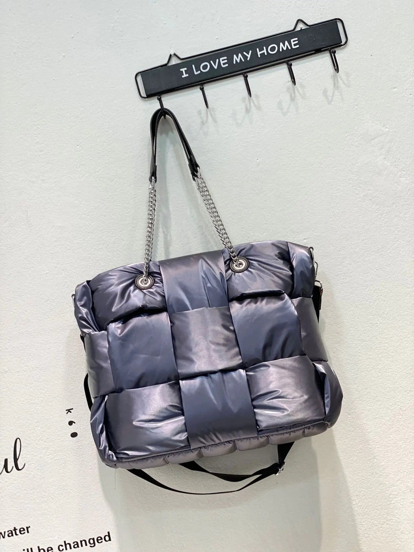 Discover the perfect blend of style and functionality with our Women's Fashionable Cotton Jacket Handheld Shoulder Feather Bag. Designed for the modern woman, this bag is crafted from durable nylon, ensuring it withstands daily use while maintaining its chic appearance.
