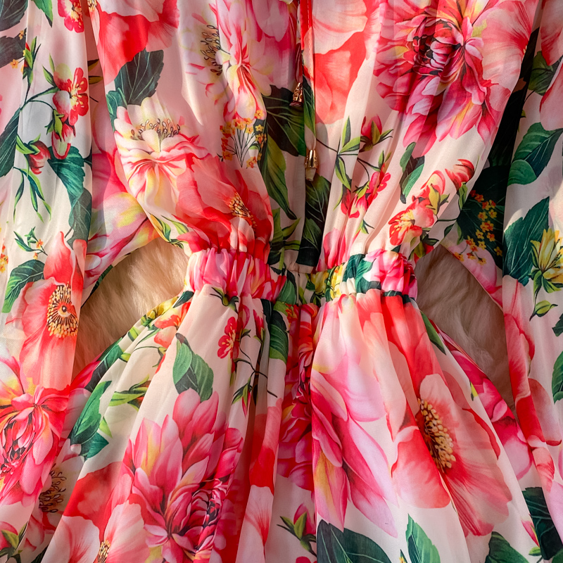 Step into elegance with our Feminine Round Neck Printed Over Knee Swing Holiday Chiffon Dress. This stunning dress is designed to embrace your femininity and keep you comfortable throughout the day.