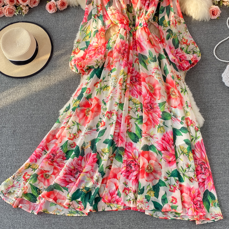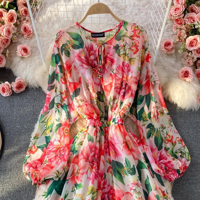 Feminine Round Neck Printed Chiffon Swing Dress