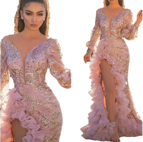 Hip Trailing Sequin Pink Long Mesh Evening Dress