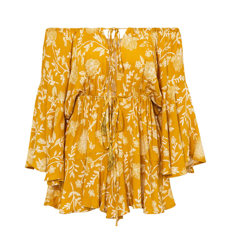 Embrace your femininity and showcase your unique style with our stunning Off-Shoulder Jumpsuit. Crafted from soft and lightweight chiffon, this exquisite piece features a beautiful floral pattern that effortlessly blends elegance and comfort. The chic off-shoulder design adds a touch of allure, while the playful tassel ties give it a fun and trendy twist.