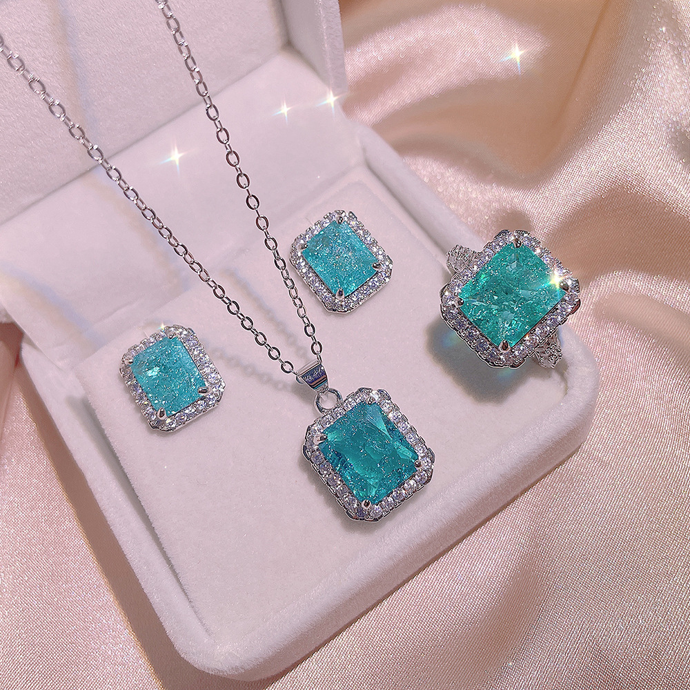Paraiba Simulation Rings and Ear Studs Necklace Set