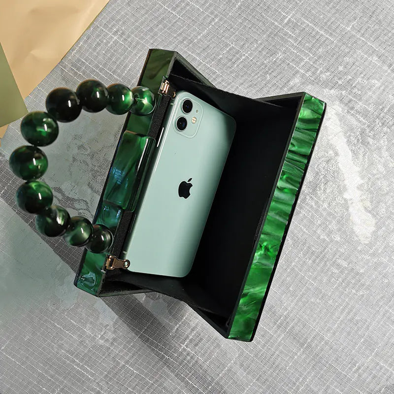 Crafted from premium acrylic, this clutch features a chic, textured design that adds a touch of sophistication to any ensemble. Available in three beautiful colors—Dark Green, White, and Light Green—you can easily choose the one that complements your style best.