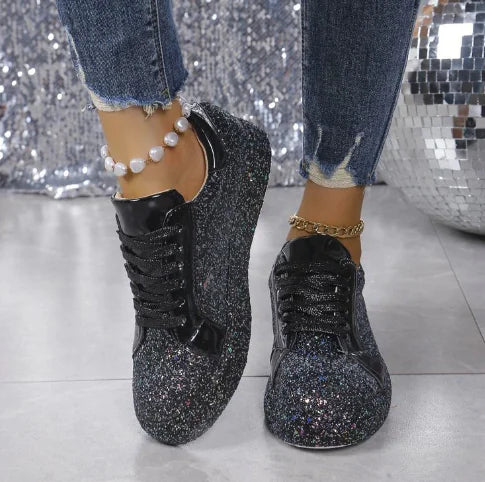Step into style and comfort with our stunning Glitter Rhinestone Sneakers. Designed for the fashion-forward woman, these shoes feature a beautiful sparkling rhinestone detail that adds a touch of glamour to any outfit. Whether you're hitting the streets or attending a casual gathering, these fashionable sneakers are sure to turn heads.